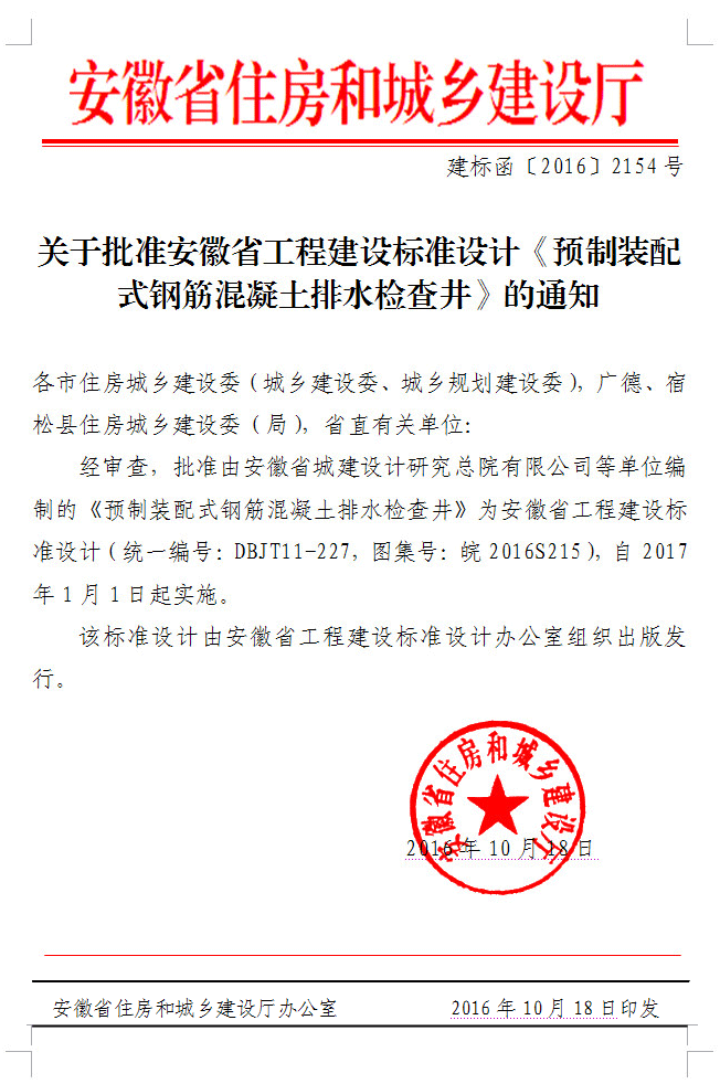 關(guān)于批準(zhǔn)安徽省工程建設(shè)標(biāo)準(zhǔn)設(shè)計(jì)《埋地排水用內(nèi)肋增強(qiáng)聚乙烯(PE)螺旋波紋管管道工程選用及安裝圖集》的通知